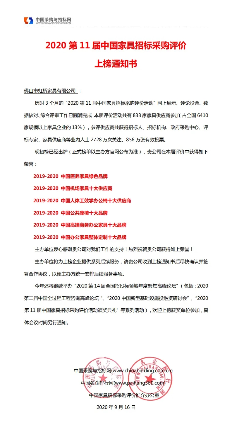]]>日前,在北京舉行的2020年第14屆全國招投標(biāo)領(lǐng)域年度聚焦盛典頒獎晚會上,中國辦公家具招標(biāo)采購評價推介活動頒獎環(huán)節(jié)備受矚目,虹橋家具憑借在市場上的出色表現(xiàn),在“2020第11屆中國家具招標(biāo)采購評價暨《招標(biāo)投標(biāo)法》實(shí)施20周年紀(jì)念活動”評選活動中榮獲第三名,同時榮獲“中國醫(yī)養(yǎng)家具綠色品牌”“中國機(jī)場家具十大供應(yīng)商”“中國人體工效學(xué)辦公椅十大供應(yīng)商”“中國公共座椅十大品牌”“中國高端商務(wù)辦公家具十大品牌”“中國辦公家具整體定制十大品牌”等多項(xiàng)榮譽(yù)。